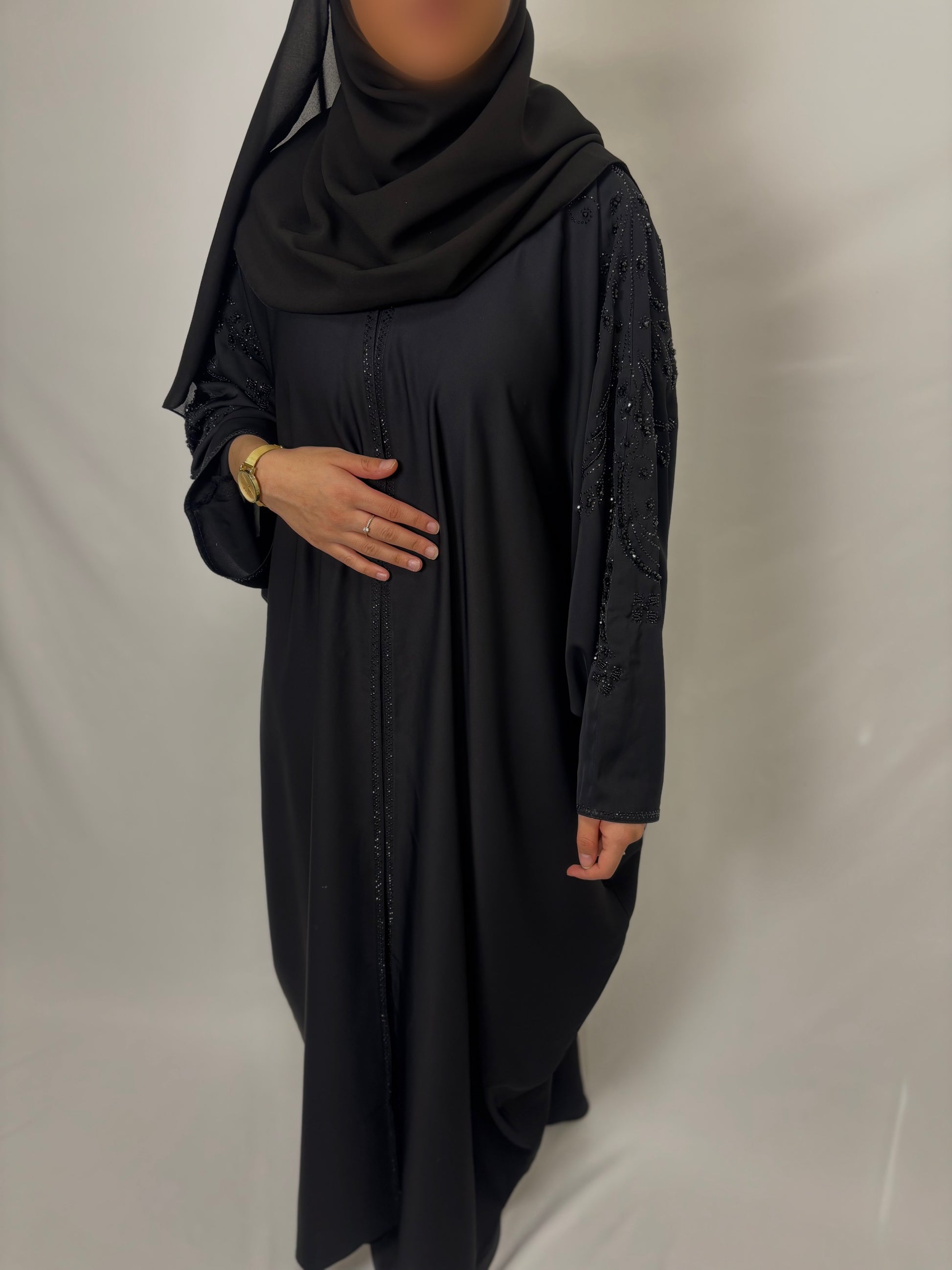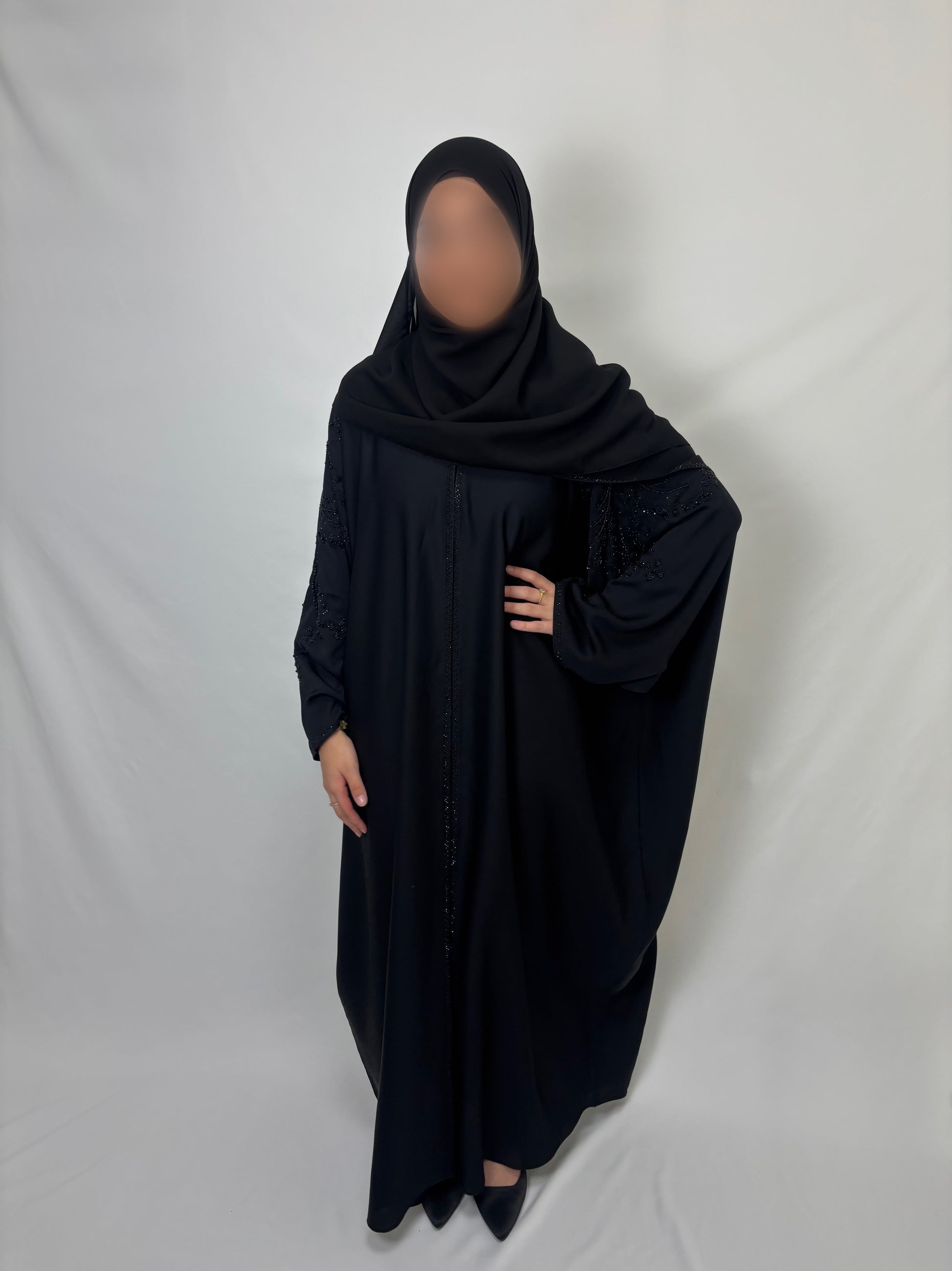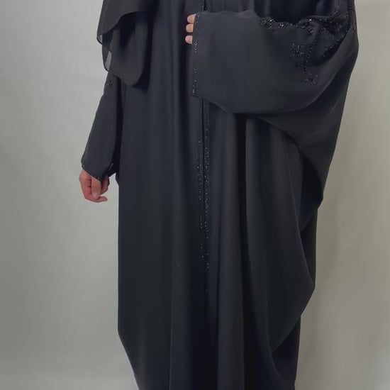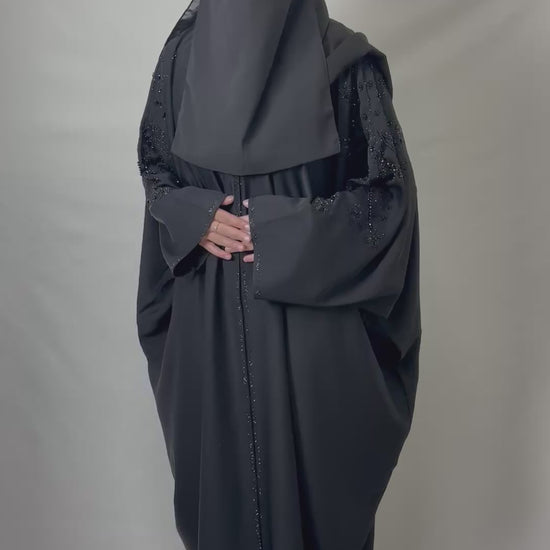 Abaya noire élégante, sublimée par des strass délicatement disposés à l’avant et à l’arrière. Une pièce sophistiquée qui capte la lumière avec finesse.